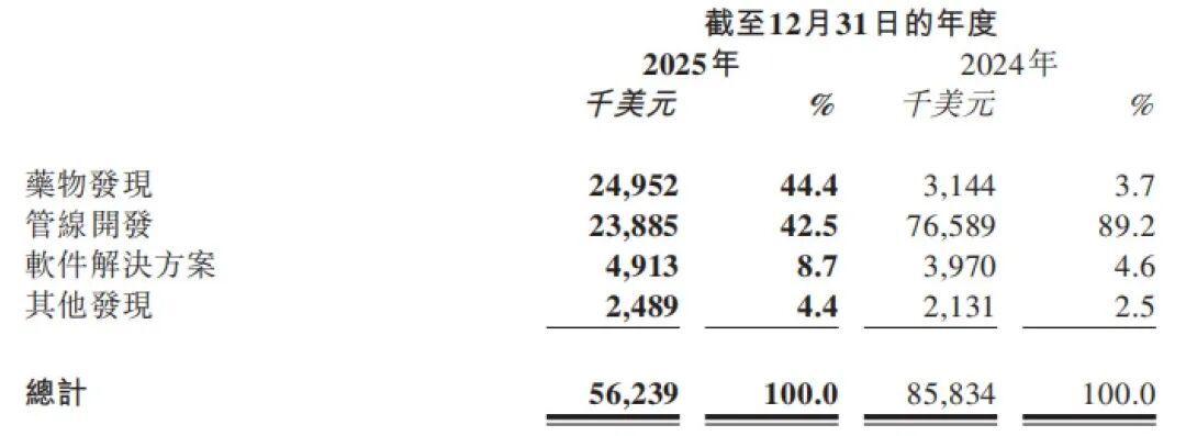 根据年报,英矽智能2025年共实现收入5623.9万美元,业务模式包括药物发现、管线开发、软件解决方案及其他与非医药领域相关的发现业务。其中,收入占比87%的药物发现和管线开发贡献,指的是药物研发项目对外授权以及与大型药企进行战略合作,从首付款、里程碑付款等获得收入。