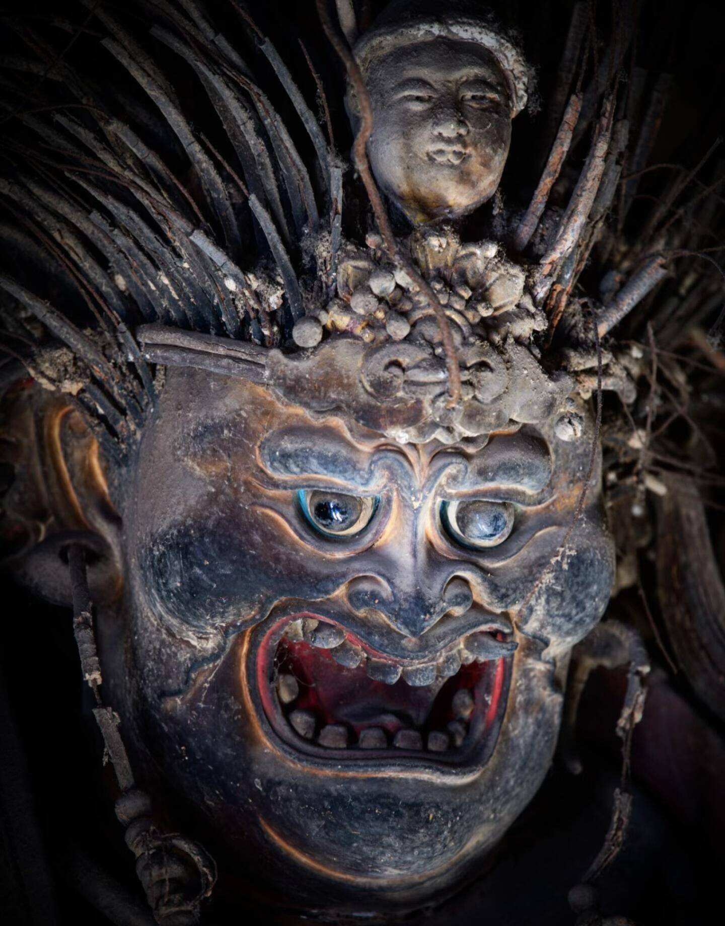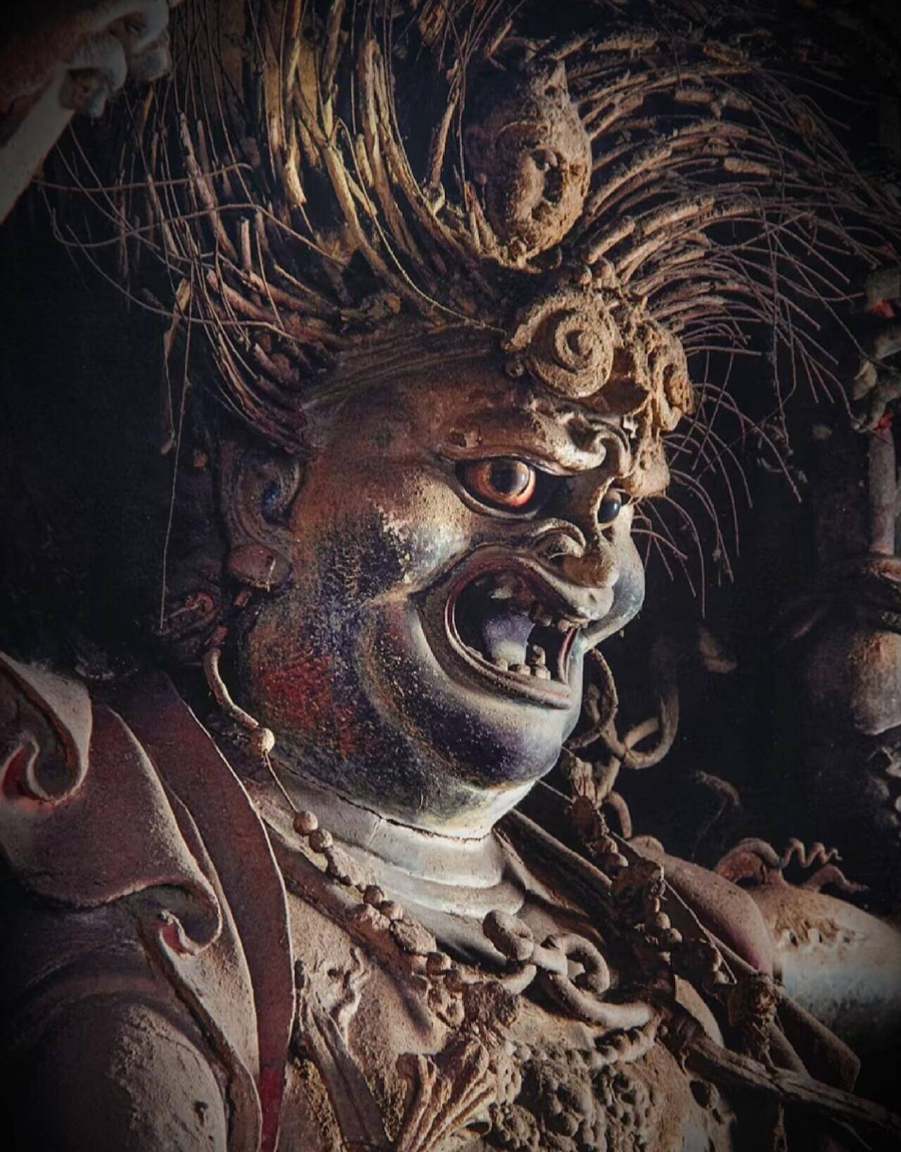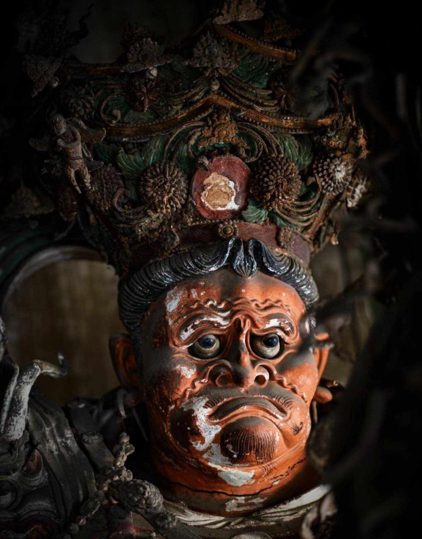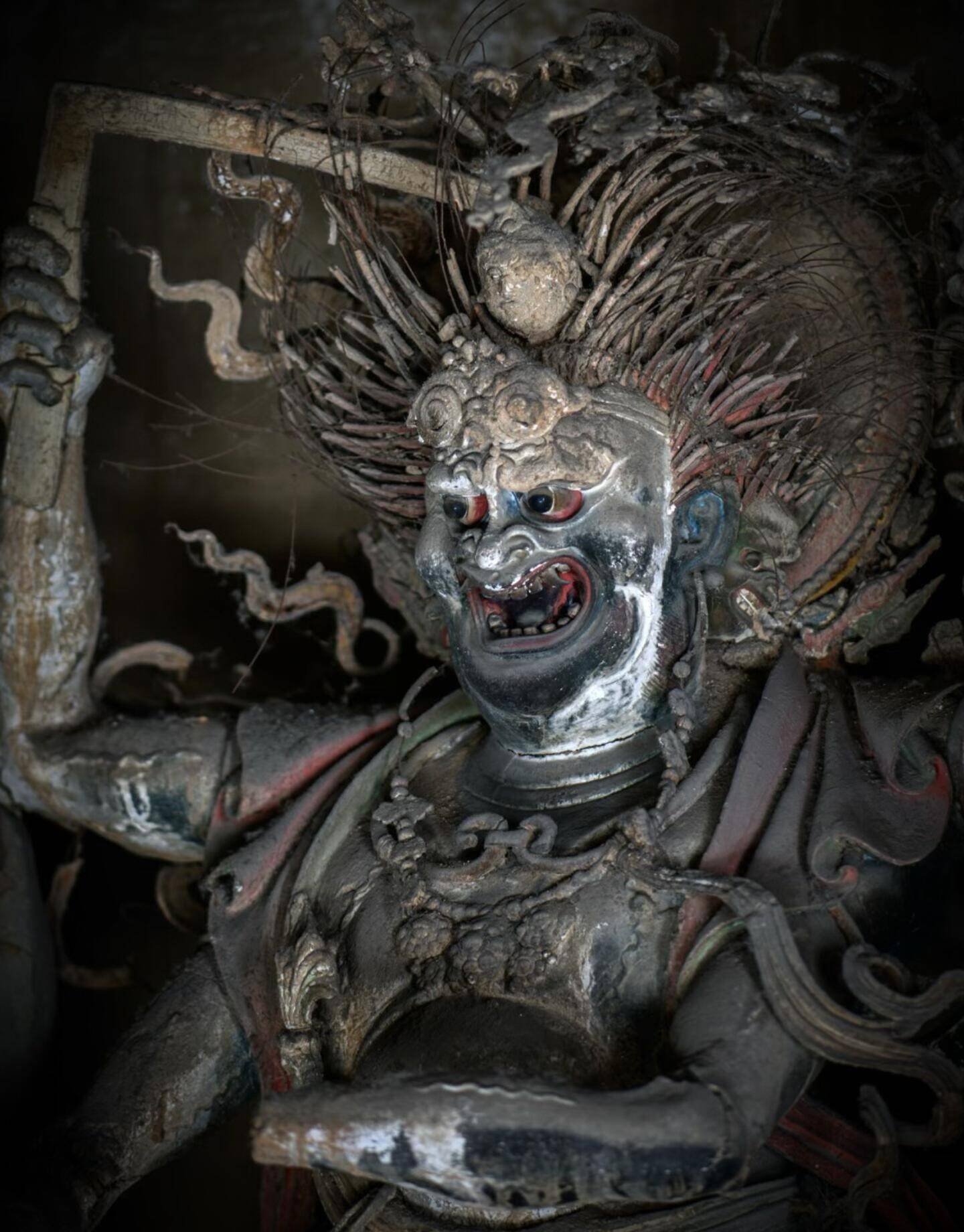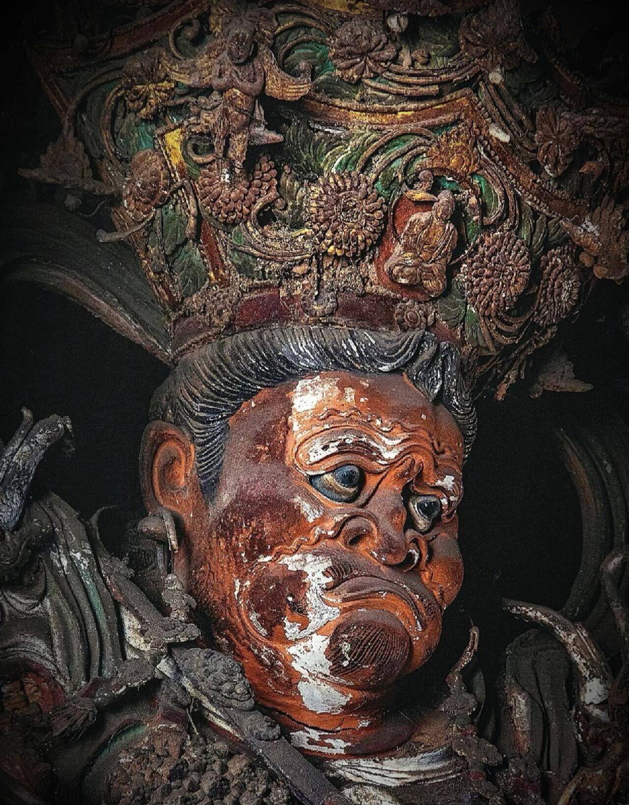 而最珍贵的,是工匠们彻底打破了审美枷锁。主流的宗教造像,大多面容慈悲,神态宁静,姿态规整,千佛一面,是标准化的庄严。铁佛寺的工匠偏不,他们抛弃所有既定范式,把世俗的观察、人性的复杂、大胆的想象,全都灌注进每一尊造像里。这里没有温和的笑,没有低垂的眼,大多是怒目圆睁,眉骨高耸,鼻梁挺直,嘴唇紧抿,有的面露凶相,有的神情冷峻,有的带着睥睨众生的傲气,有的藏着不容置喙的威严。他们不再是被符号化的神,而是有性格、有情绪、有力量的守护者。工匠们把人间的勇武、刚烈、桀骜,都揉进了神的面孔里,让每一尊造像都有独一无二的灵魂。没有两尊脸是重复的,没有两个姿态是雷同的,有的刚猛如战将,有的冷峻如判官,有的温婉中藏着锋芒,女性造像也不见柔媚,反而自带一股凛然不可侵犯的气场。这种狞厉之美,粗粝、直白、充满生命力,不迎合,不讨好,不取悦任何人,只是忠于创作,忠于内心的表达。
