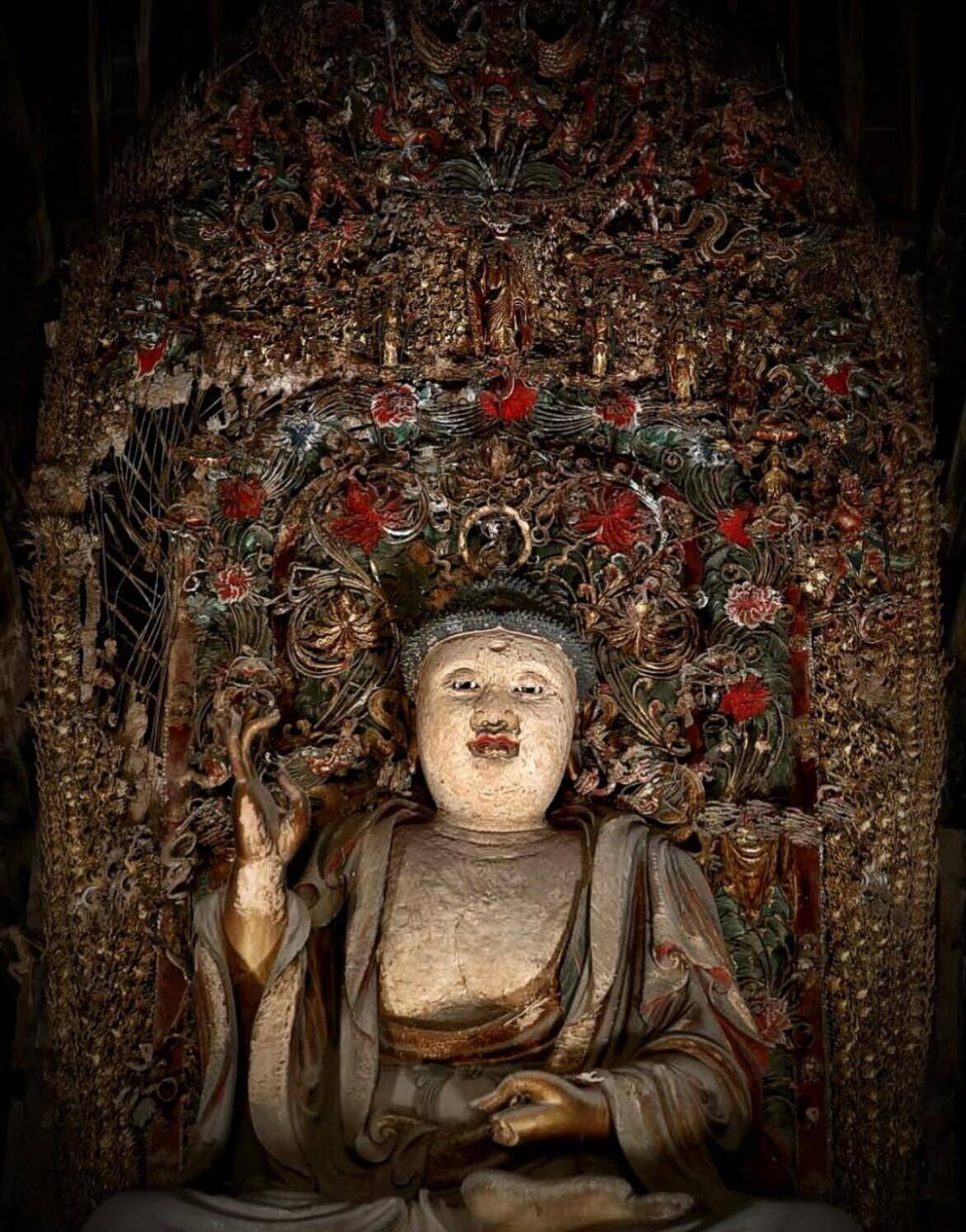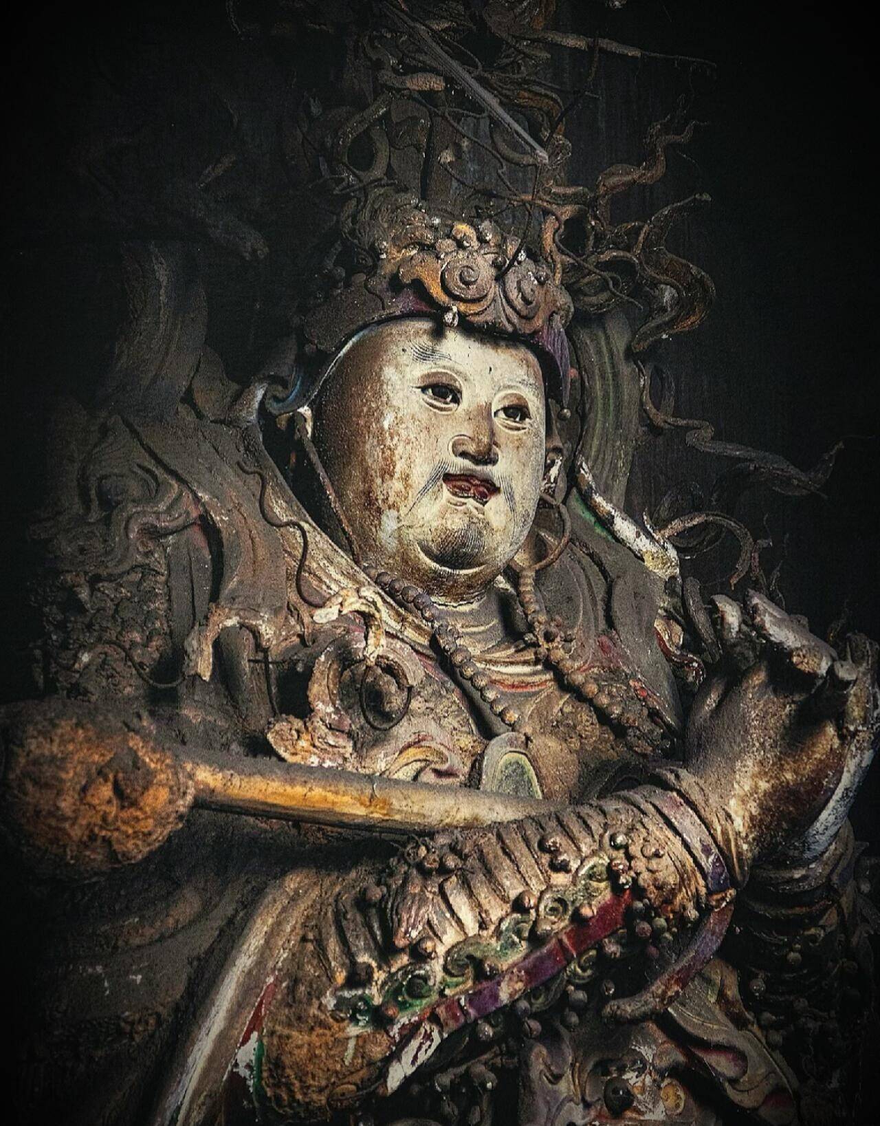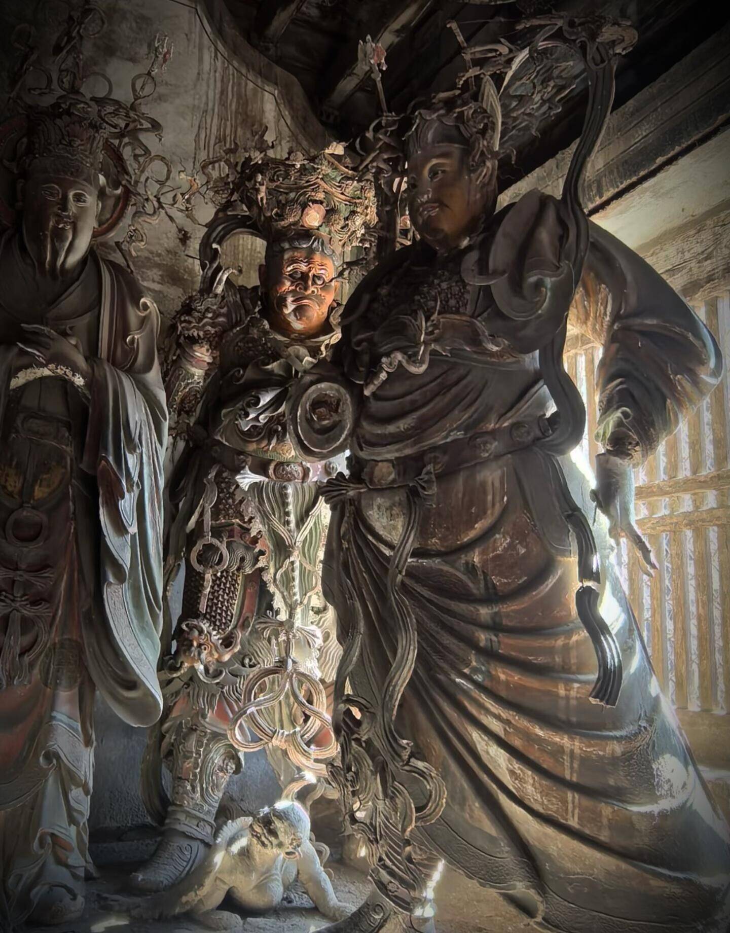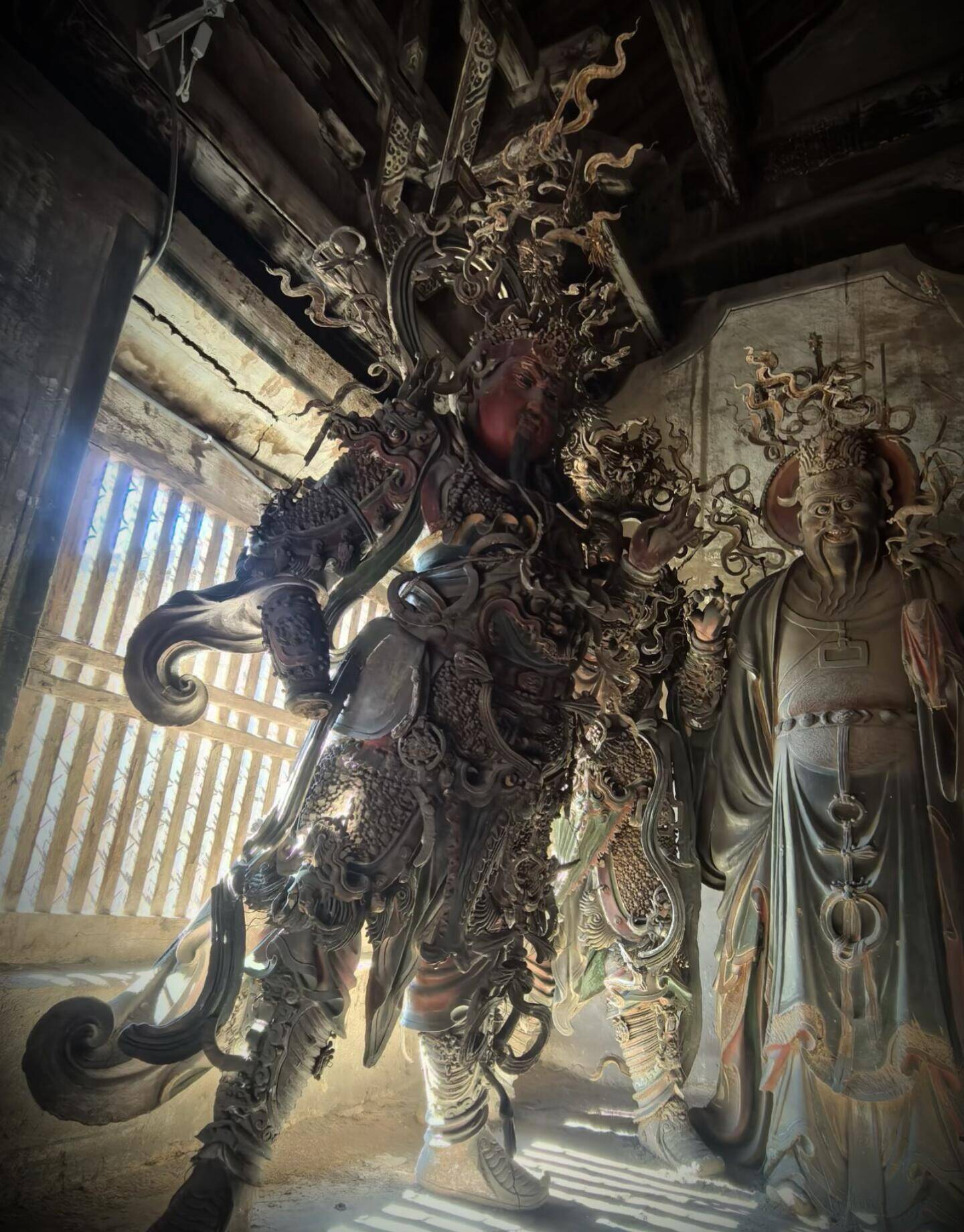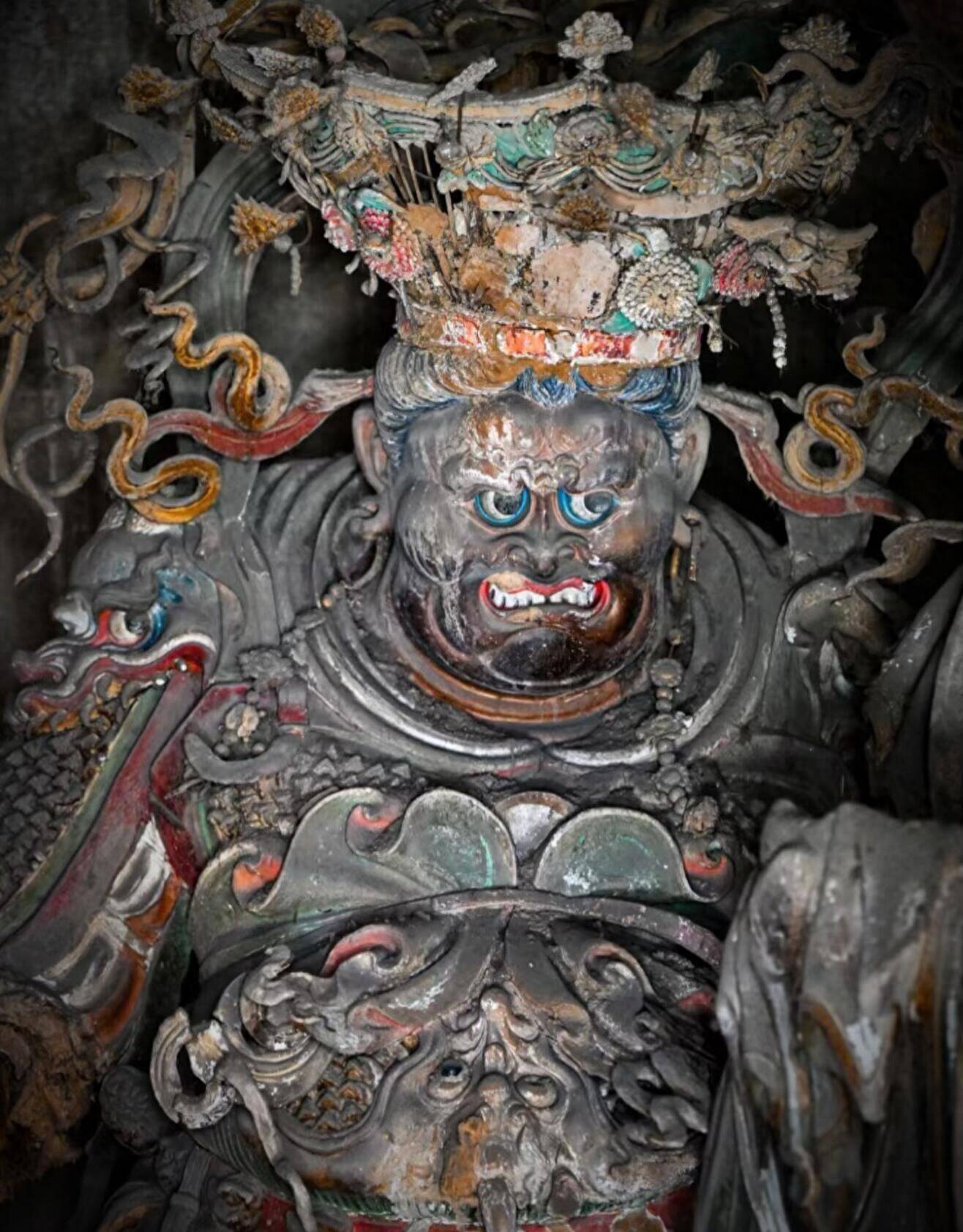 工艺上的独创,更是铁佛寺立足的底气。别处的彩塑,多以木骨为架,泥草为胎,造型偏于规整柔和,而铁佛寺的工匠,直接把当地发达的冶铁技术用在了造像上,创造出独一份的铁骨泥胎技法。以木为主架,以铁丝为筋骨,细如发丝的铁线,弯转折叠,随心所欲,用来塑须发、飘带、铠甲、纹饰,再敷以泥胎,施彩贴金。铁丝的柔韧,是木骨永远比不了的,它能让一缕发丝根根倒竖,能让一片飘带凌空飞举,能让铠甲鳞片层层叠叠,边缘锋利如真,能让装饰纹样繁复到极致,却丝毫不显臃肿。每一处细节都被拉满,每一根线条都充满张力,静态的塑像,因此有了动态的狂放。你凑近看,能看到铁丝撑起的肌肉线条,能摸到铠甲上锋利的棱角,能感受到衣袂翻飞的力度,这种刚柔并济的质感,是传统泥塑永远无法企及的。高平自古产铁,工匠们就地取材,把乡土技艺与宗教造像结合,没有照搬范本,没有墨守成规,用最接地气的材料,做出了最超凡的艺术。